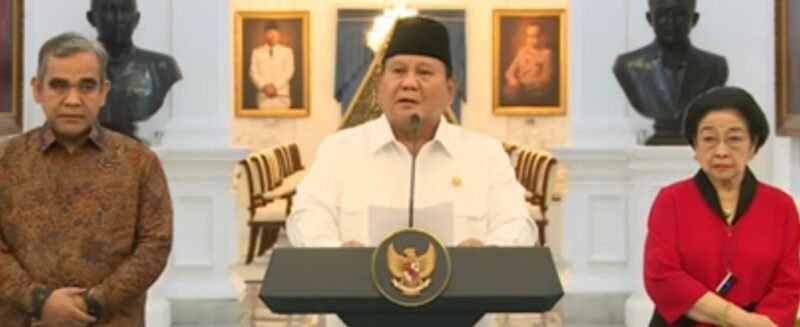 “Hari ini saya didampingi Presiden Republik Indonesia kelima Ibu Megawati Soekarno Putri, Ketua Majelis Permusantarahan Rakyat Republik Indonesia, Saudara Ahmad Muzani, Ketua DPR RI, Saudari Puan Maharani, Ketua DPD RI, Saudara Sultan Najamuddin,” kata Prabowo dalam konferensi pers.