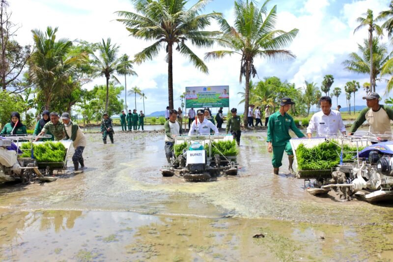 Sebagai simbol dimulainya penanaman modern berbasis mekanisasi, Bupati Bone bersama Dandim, Kapolres, dan Kadis Pertanian turut mengoperasikan mesin transplanter di tengah sawah.