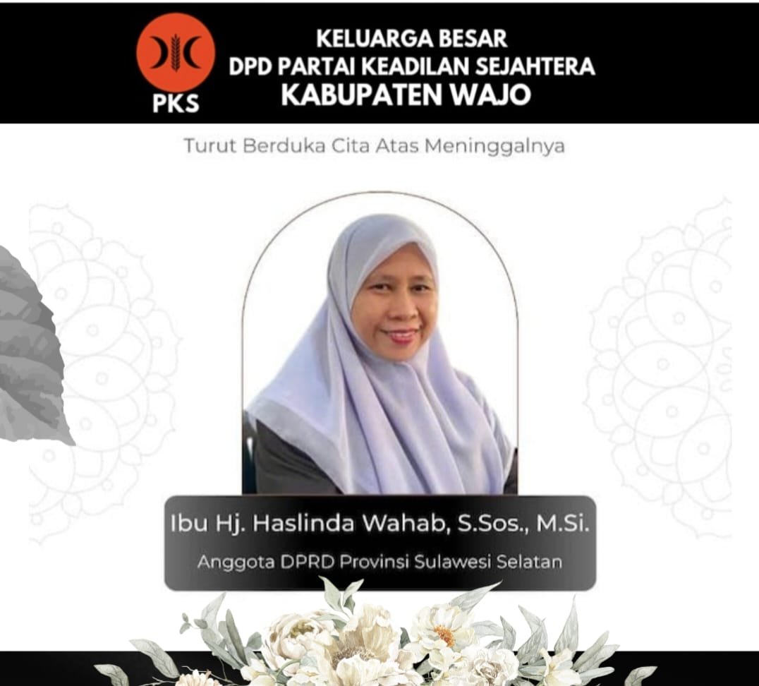 WAJO.BONEKU.COM,– Kabar duka menyelimuti keluarga besar Partai Keadilan Sejahtera (PKS) Sulawesi Selatan. Salah satu kader perempuan terbaiknya, Hj. Haslinda Wahab, meninggal dunia di RS Hermina Makassar pada Ahad, 7 Desember 2025.