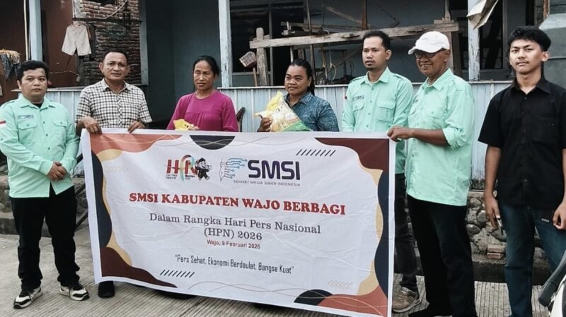 WAJO.BONEKU.COM,–  Dalam rangka memperingati Hari Pers Nasional (HPN) 2026, Serikat Media Siber Indonesia (SMSI) Kabupaten Wajo menggelar kegiatan sosial berupa pembagian paket sembako kepada masyarakat, Senin (9/2/2026).