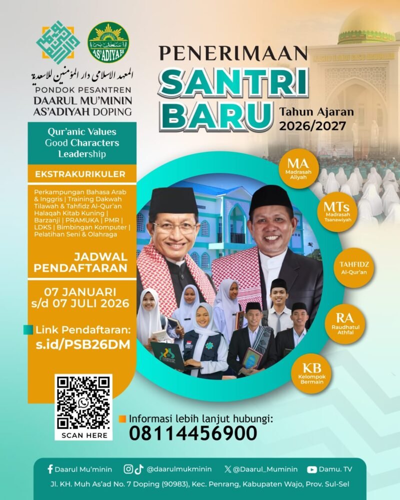 WAJO.BONEKU.COM,– Pondok Pesantren Daarul Mu’minin Assadiyah Doping yang berlokasi di Kecamatan Penrang, Kabupaten Wajo, Sulawesi Selatan, resmi membuka Pendaftaran dan Penerimaan Santri Baru (PSB) untuk tahun ajaran 2026/2027.