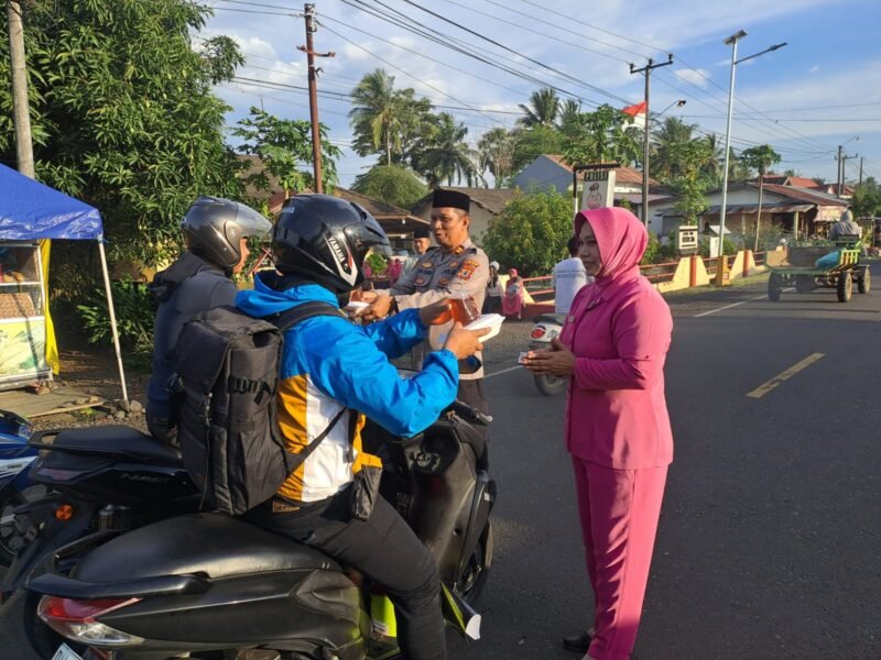 Personel Polsek Cina Polres Bone yang dipimpin langsung Kapolsek Cina, IPTU Rusdi A.Md., S.H., didampingi Ketua Ranting Bhayangkari Polsek Cina, Ny. Husna Rusdi, turun langsung ke jalan membagikan takjil gratis kepada para pengguna jalan.